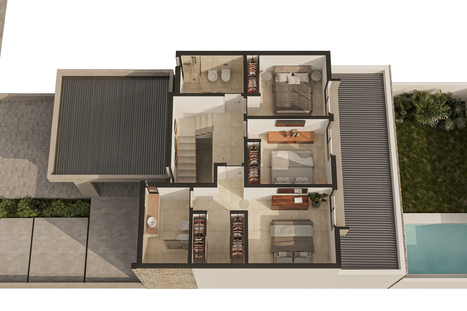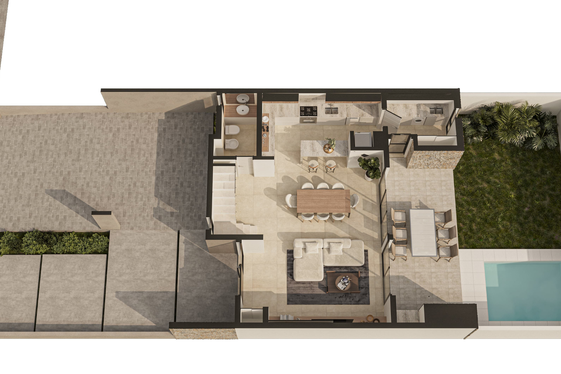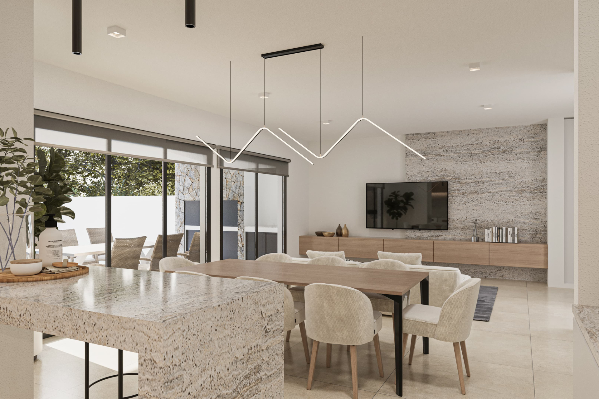 Esta vivienda es un claro diseño de Grupo Concret. Ofrece ambientes conectados que potencian la amplitud y la comodidad. La cocina integrada se fusiona con la sala y el comedor, creando un espacio dinámico y acogedor. El área exterior, con piscina y galería, invita al descanso y la vida social.
