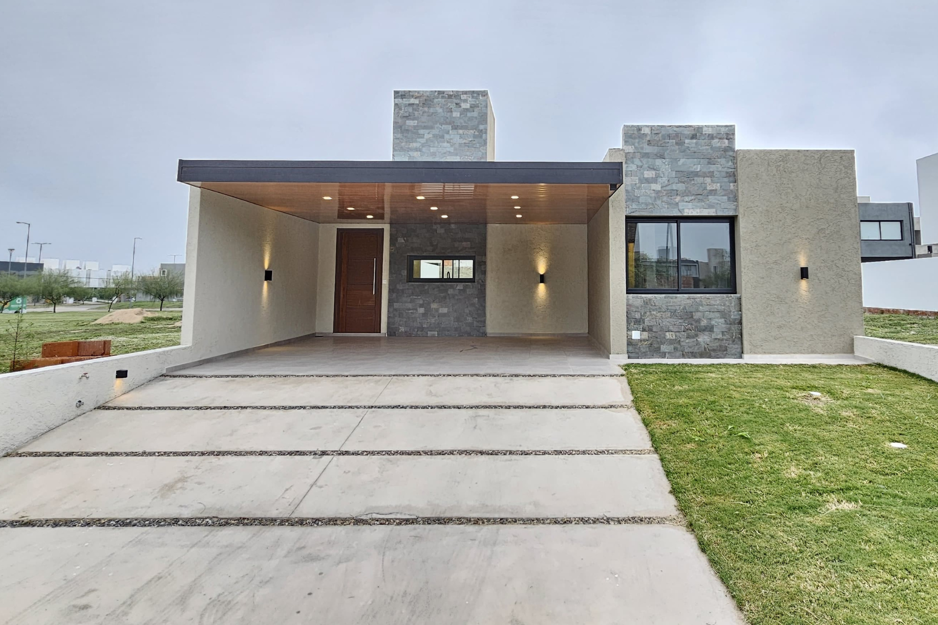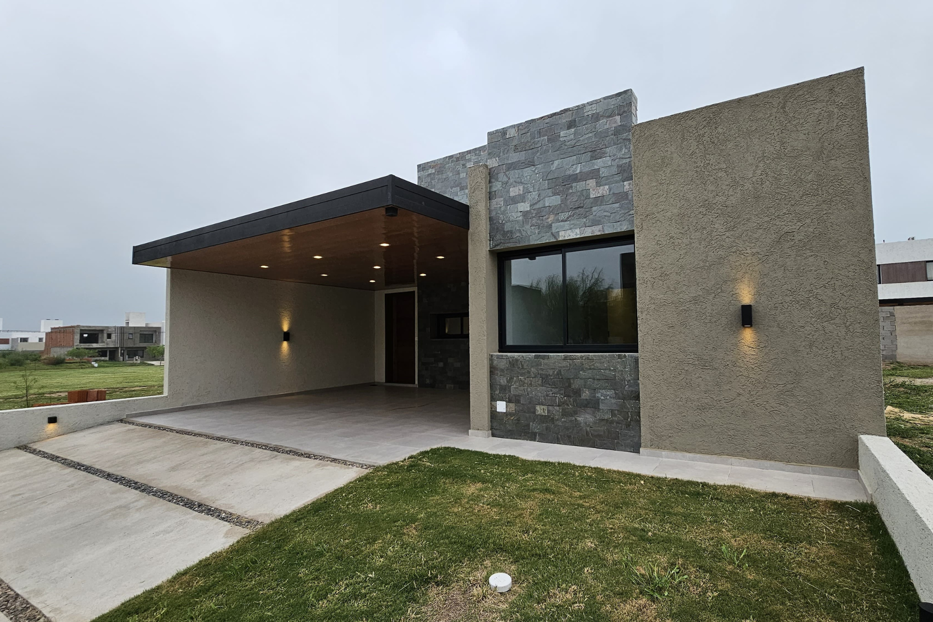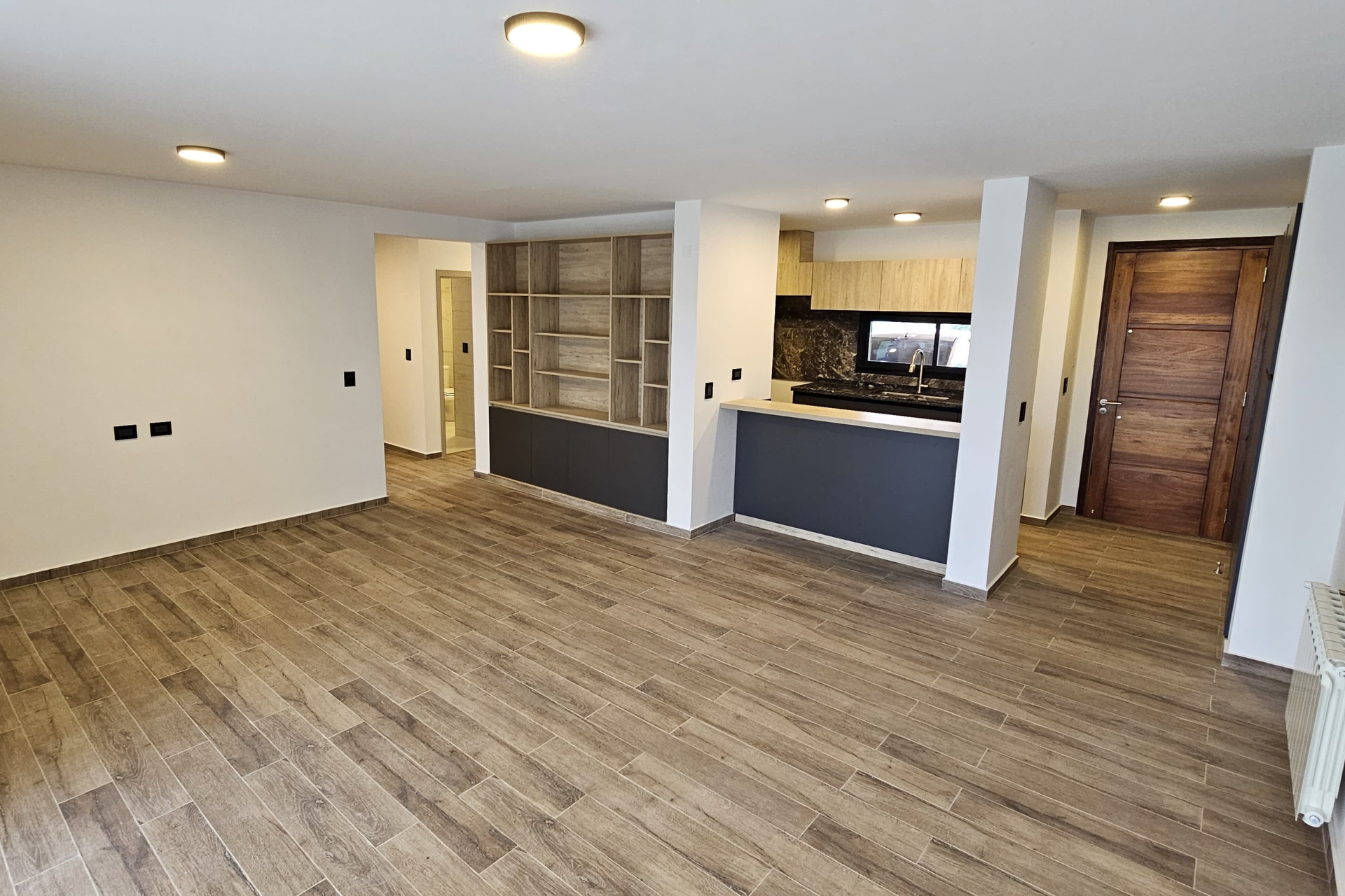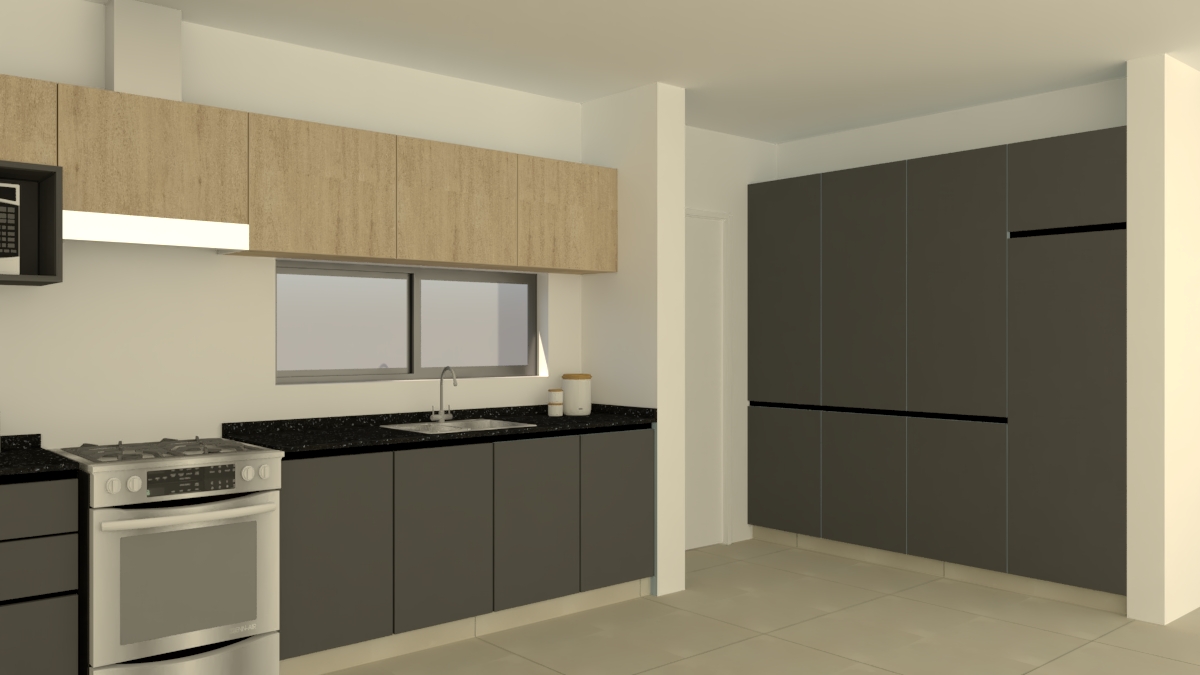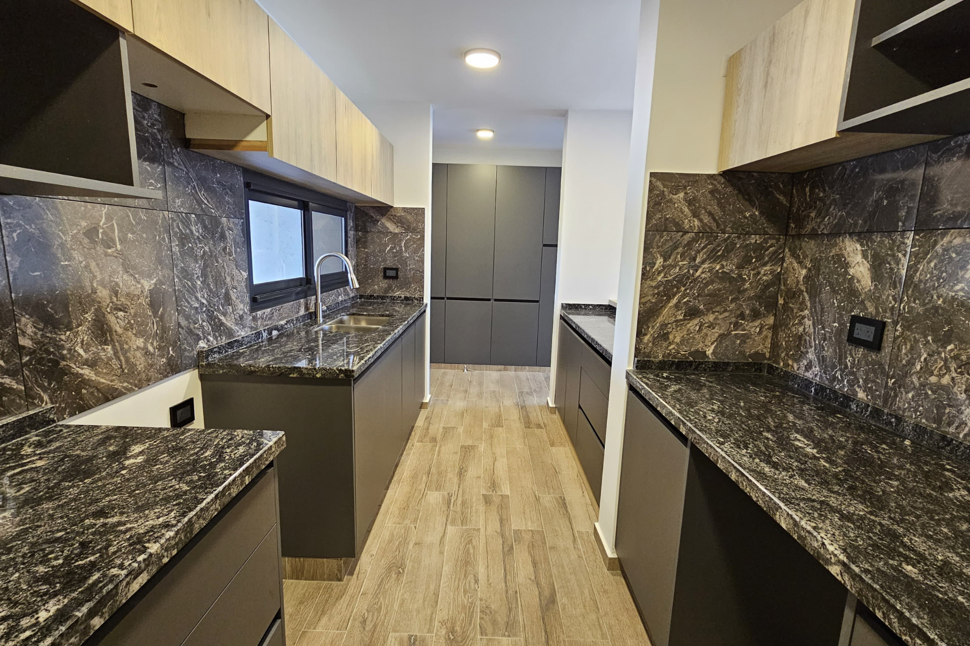 Una vivienda elegante y contemporánea que combina materiales de alta calidad y un diseño funcional. El interior cuenta con pisos de parqué de madera, que aportan calidez y sofisticación a los espacios. La cocina se destaca por una mesada de mármol oscuro, creando un contraste armonioso con el resto del ambiente.